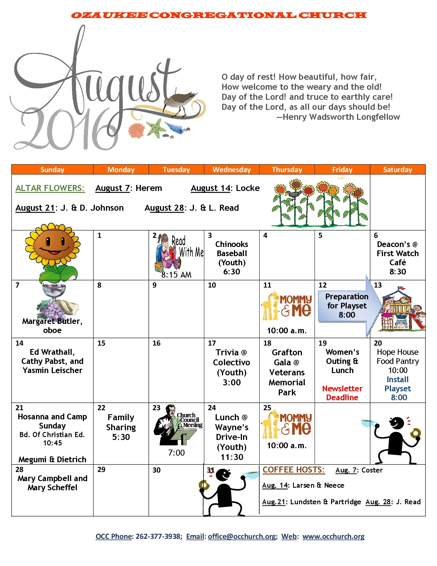 August Newsletter & Calendar July 28, 2016 Ozaukee Congregational Our August Newsletter & Calendar are here! ☀️😎 Can't wait to see you for the final month of summer.August 2016 NewsletterAugust 2016 Calendar